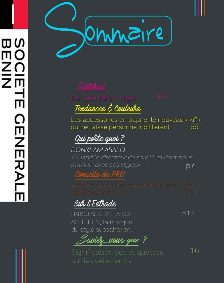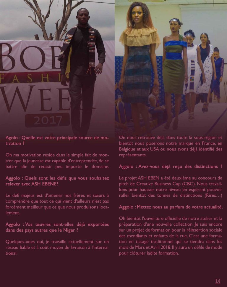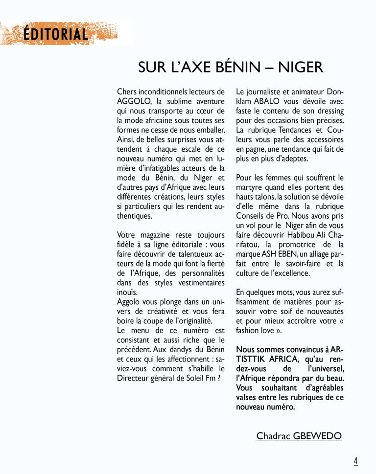 Le mois de Février vous ouvre ses portes avec le deuxième numéro de votre magazine AGGOLO. Le long de cette revue, vous découvrirez à la une, le Directeur de la radio Soleil FM du Bénin, Donklam ABALO qui dévoile dans la rubrique « Qui porte quoi » son incroyable style vestimentaire. Vous découvrirez aussi l’une des plus jeunes créatrices de mode nigérienne Habou Ali CHARIFATOU à travers la marque ASH EBEN. Les rubriques « Tendances et Couleurs » et « Conseils de Pro » vous plongeront à tour de rôle dans l’univers des accessoires customisés et des solutions toutes simples pour finir avec les douleurs que nous impose le port des chaussures hauts talons.