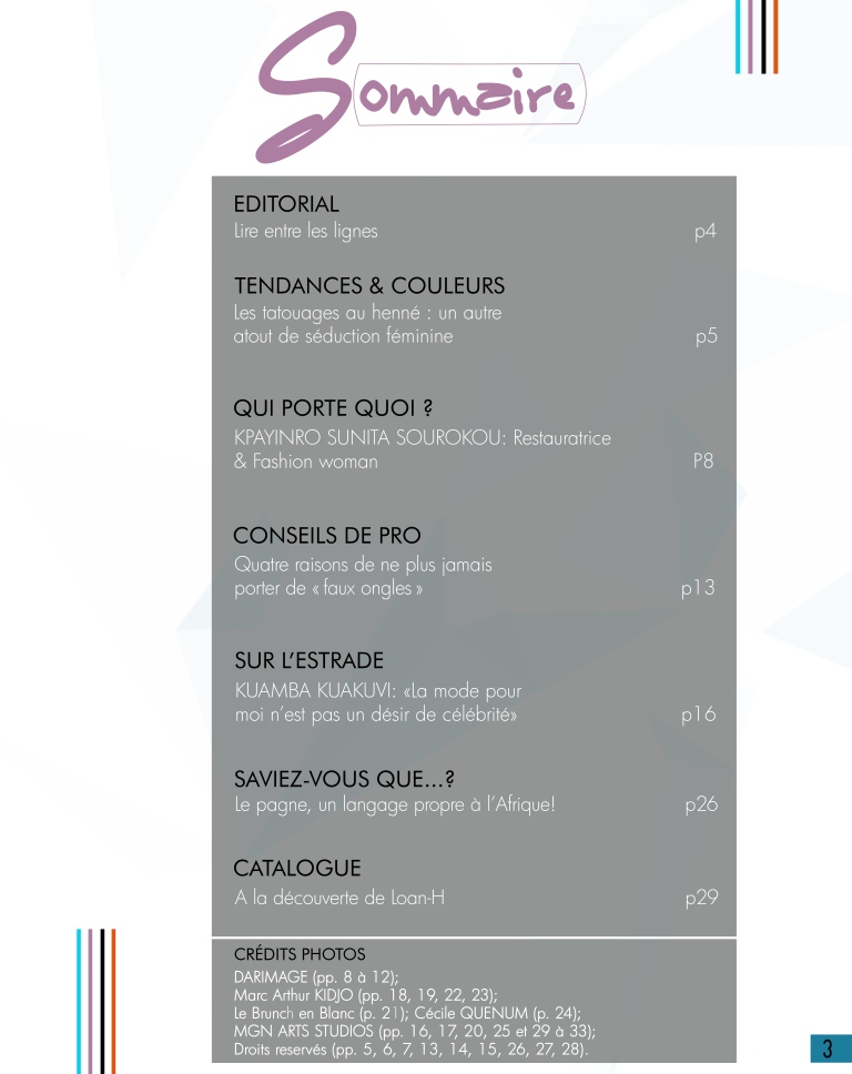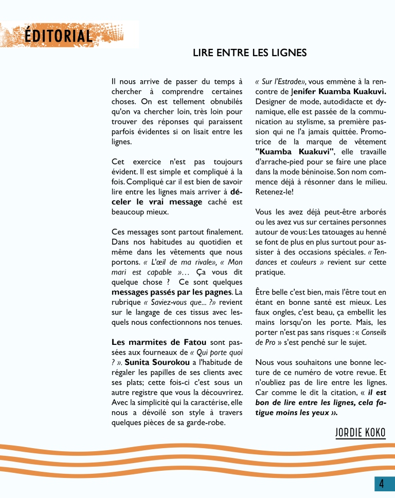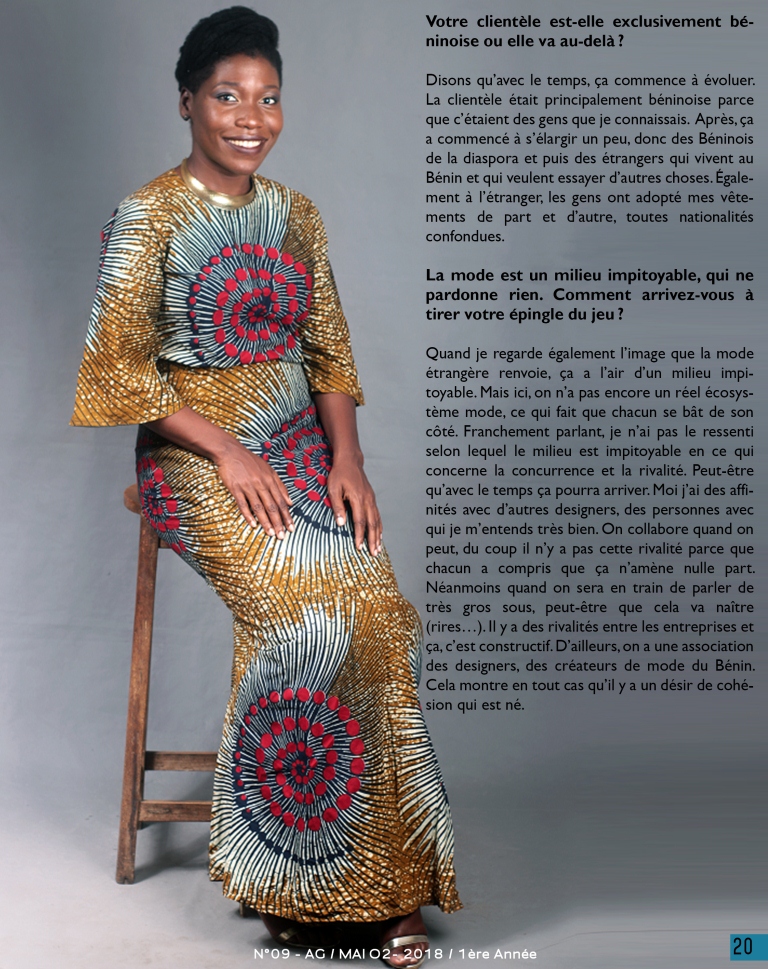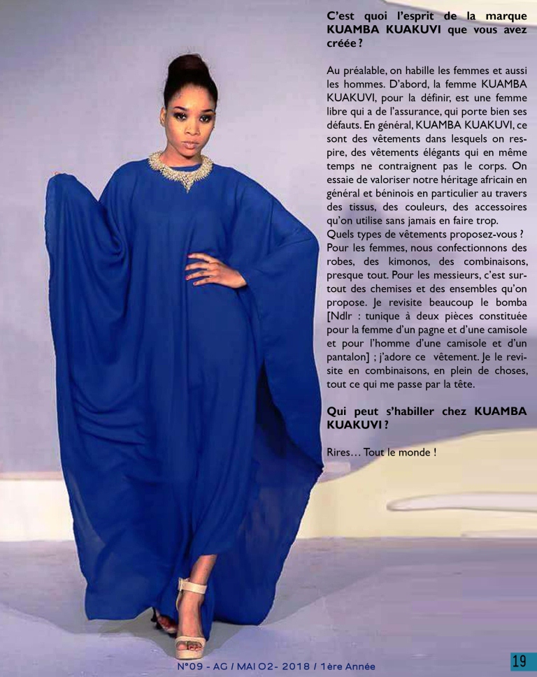 Marché conclu, jamais rompu ! Le numéro 09 d’Aggolo est disponible avec l’actrice béninoise de la mode Kuamba Kuakuvi en couverture. C’est une pépite qui jaillit des ombres, une créatrice humble et perspicace qui s’est confiée à notre équipe. Découvrez dans « Qui porte quoi ? » Sunita Sourokou, la restauratrice qui frime. Eh oui, bien-sûr ! Les tatouages au henné, le mal des faux ongles, les pagnes africains et leur langage satirique et provocateur sont également des sujets à découvrir dans ce numéro qui nous l’espérons vous en apportera autant en mode que culture générale, couleurs, beauté et surprises… Lisez et Partagez dans vos réseaux !