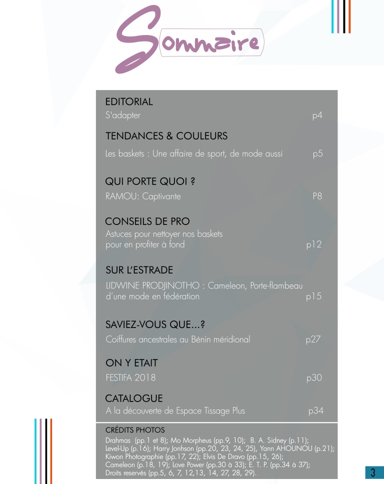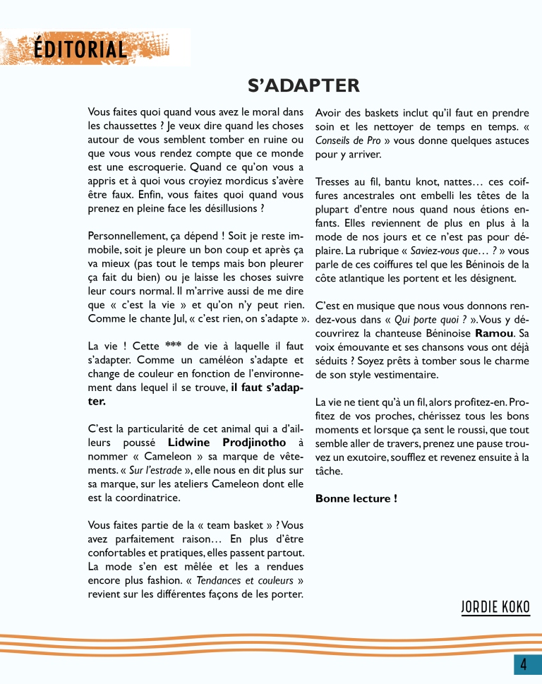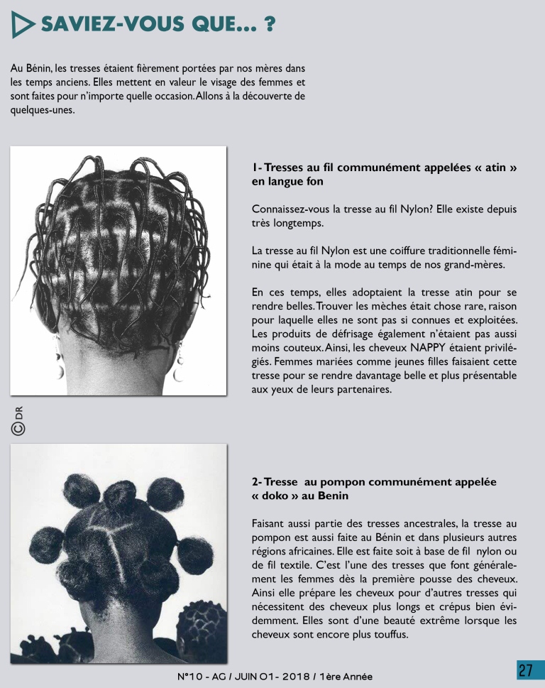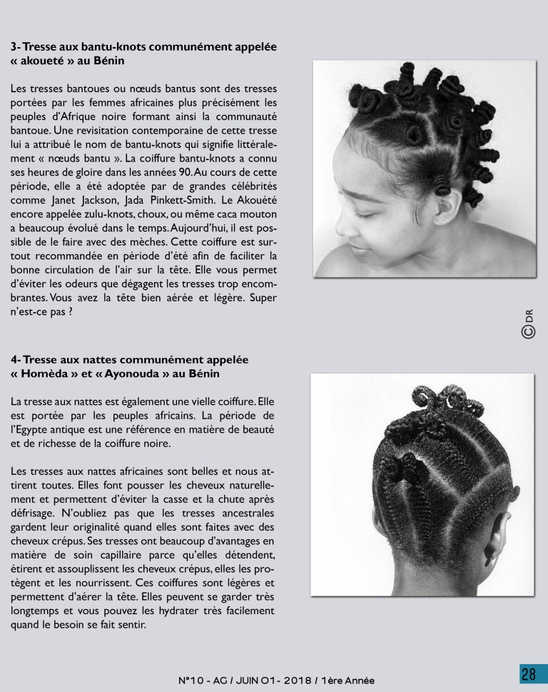L’édition 10 de votre revue de mode Aggolo est toute au féminin et Béninoise ! Avec Ramou comme tête d’affiche. Cette artiste chanteuse a une voix d’or et un look conséquent à découvrir ici. « Sur l’Estrade » reçoit la jeune entrepreneure Lidwine Prodjinotho, coordinatrice des ateliers Cameleon. La rubrique « Tendances et Couleurs » aborde la déferlante des paires de basket, tendance de nos jours ; « Conseils de Pro » vous donne des astuces pour mieux les entretenir. D’autres informations utiles sur quelques coiffures anciennes qui continuent de s’imposer au Bénin vous plairont très certainement. Lisez et partagez à vos amis.