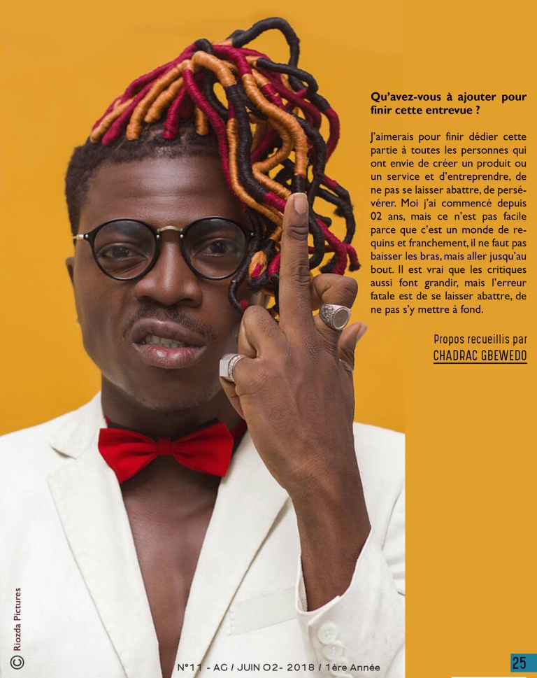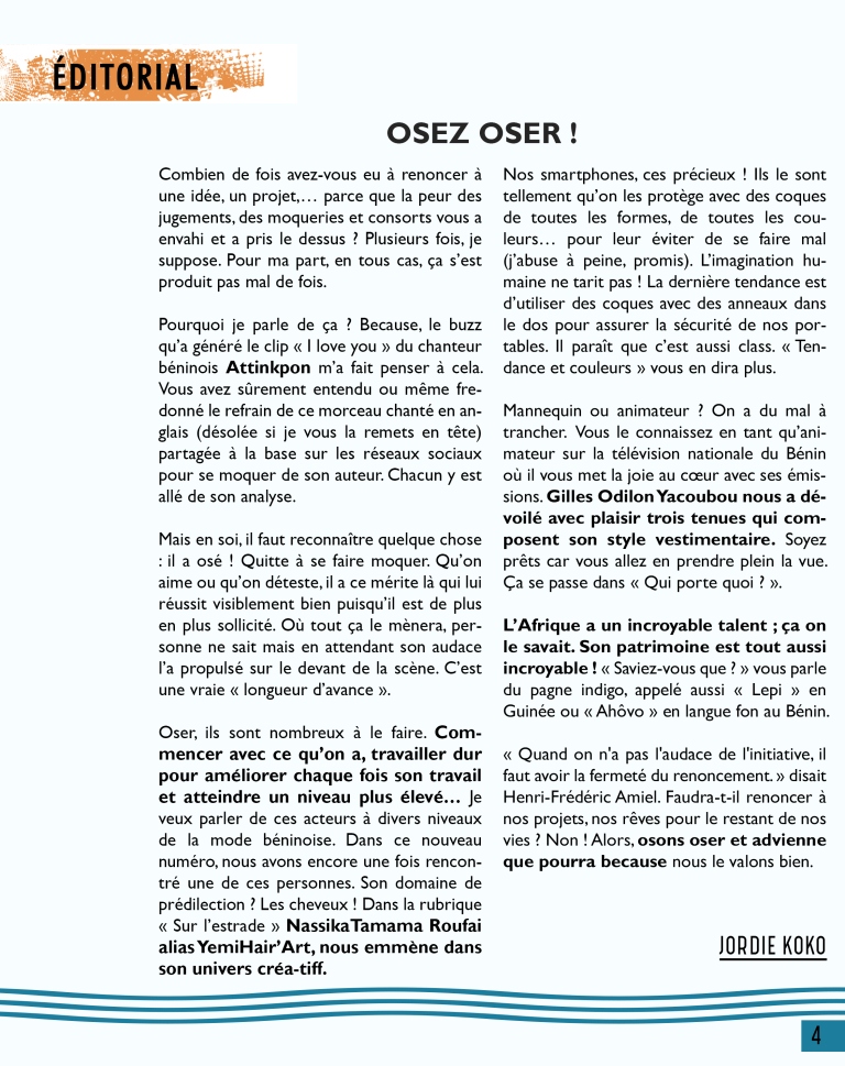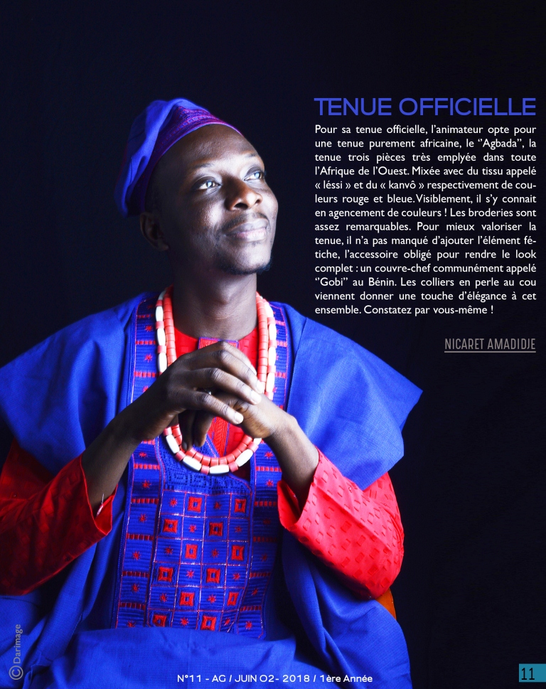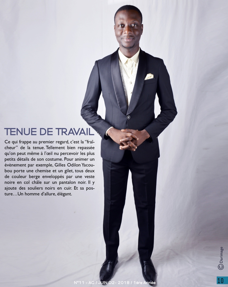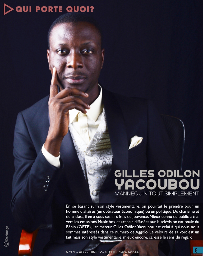Cher.e.s fidèles d’Aggolo, voici la onzième parade de votre revue qui vous dit, comme à chaque fois, beaucoup de belles choses. Ce numéro fait la part belle à la jeunesse béninoise qui ose oser, qui ose créer, qui charme. Pour ainsi dire, Gilles Odilon Yacoubou, l’animateur vedette de la télévision nationale béninoise, assure le mannequinat de service, pour votre plaisir. Un bref et saisissant aperçu de son dressing vous est proposé dans « Qui porte quoi ».