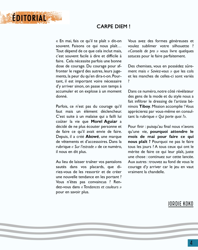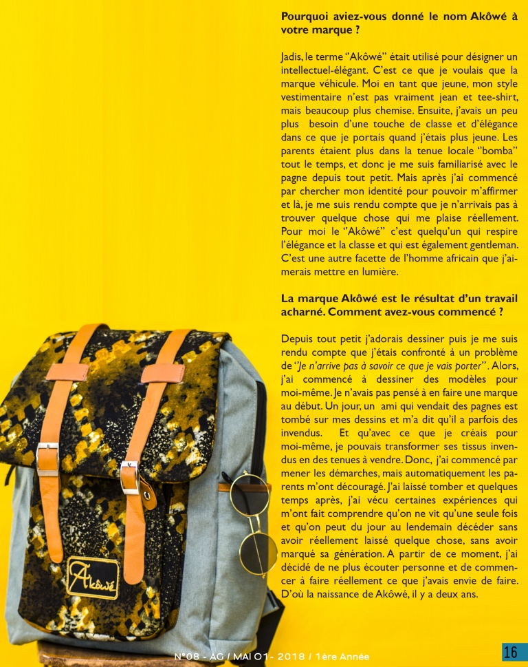Aggolo numéro 08 est prêt ! Vous avez hâte de redécouvrir votre revue africaine de mode 100% numérique !? Nous en sommes flattés. Ce numéro contient en effet de quoi vous informer et vous nourrir les yeux : Le style vestimentaire de l’artiste béninois de la chanson urbaine Tiboy, la marque Akôwé, la mode du pantalon sauté, etc.